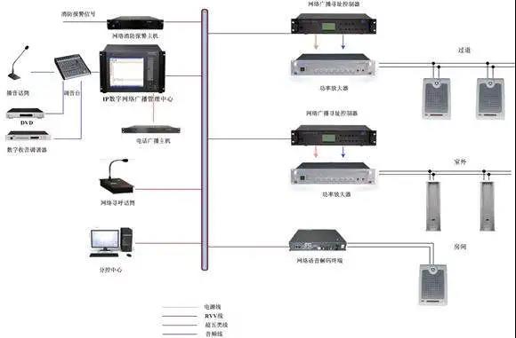 消防廣播系統用于在發生火災時指揮現場人員安全疏散,采用多路總線結構,信號傳輸使用銅芯絕緣導線(該系統可與音樂/廣播系統合用)。