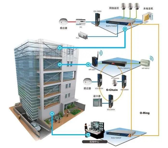 使用計算機、智能卡門鎖、讀卡器等設備,對各出入口狀態進行設置、監視、控制和記錄等,實現對建筑物各出入口統一管理,保證大樓安全,其拓撲結構和傳輸介質因產品而異。